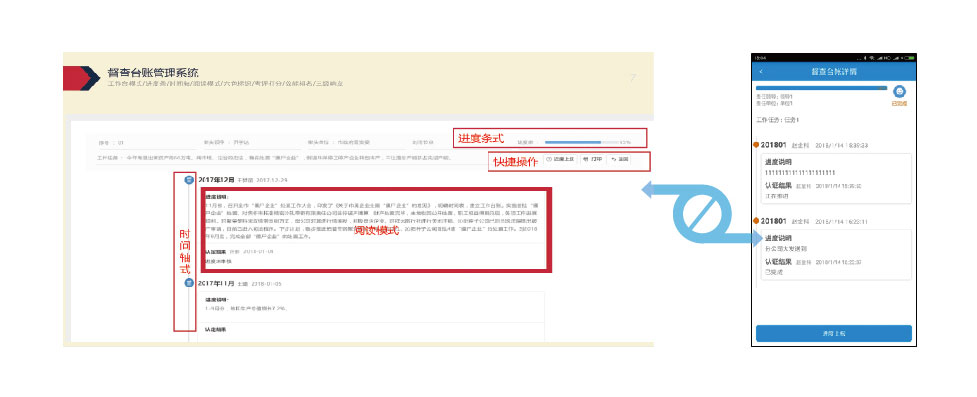 督查項(xiàng)目信息以進(jìn)度條加時(shí)間軸方式顯示,以閱讀模式呈現(xiàn),并支持圖片、聲音、視頻、附件多文本排版方式,進(jìn)度上報(bào)和評(píng)定信息互相對(duì)應(yīng),達(dá)到瀏覽方便、排版精致、閱讀便捷、理解容易的應(yīng)用目的。