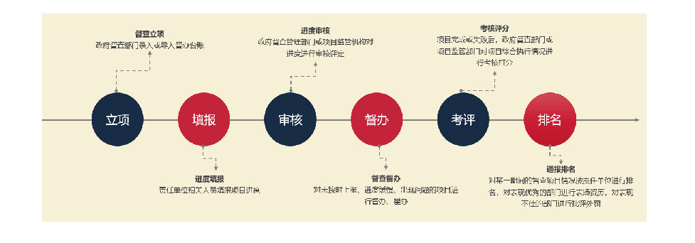 系統(tǒng)從督查項(xiàng)目的登記立項(xiàng)到進(jìn)度填報(bào)→進(jìn)度審核→督辦崔辦→考評(píng)打分→評(píng)比排名進(jìn)行流程化、全過(guò)程管理,對(duì)各類工作實(shí)現(xiàn)“事前、事中、事后”的全過(guò)程督查督辦,實(shí)時(shí)跟蹤工作進(jìn)展,使其成為黨政領(lǐng)導(dǎo)機(jī)關(guān)的工作管理推進(jìn)的有力抓手。