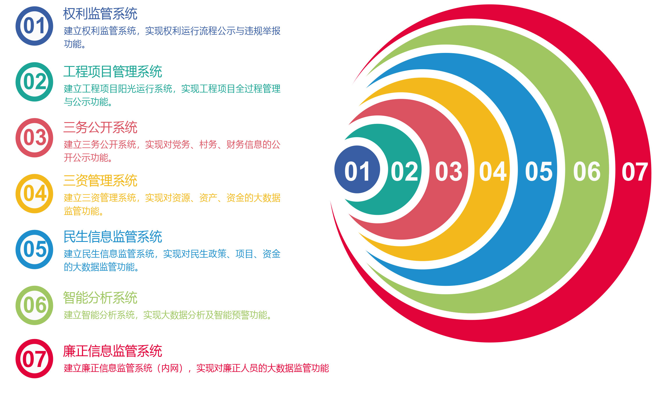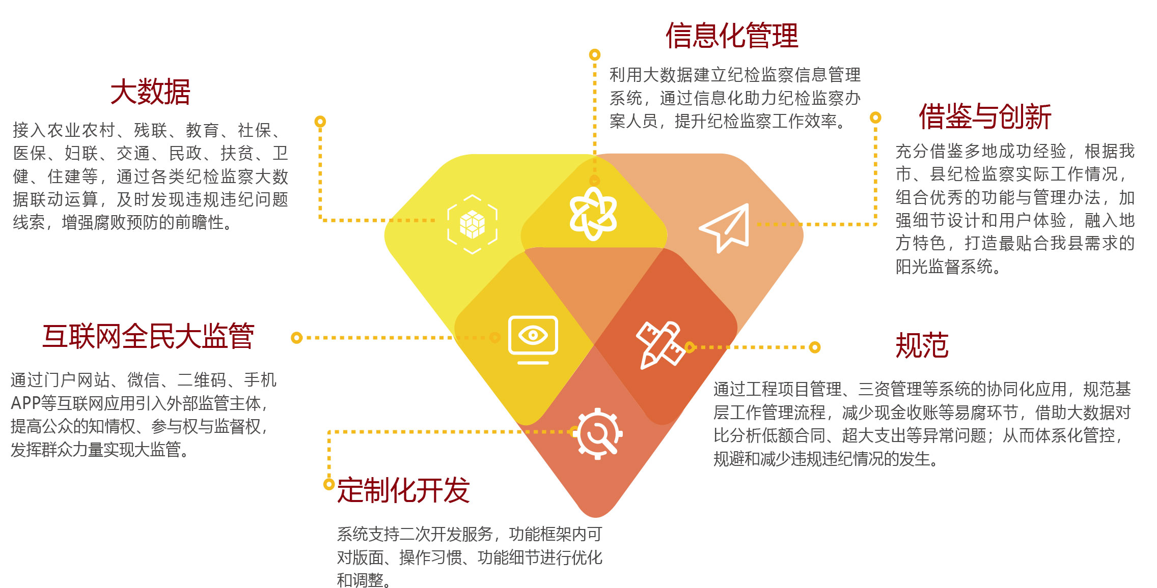 為加強(qiáng)基層權(quán)力監(jiān)管、有效整治“小微腐敗”,我方結(jié)合市、縣級(jí)紀(jì)檢監(jiān)察應(yīng)用需求,研發(fā)了紀(jì)檢監(jiān)察大數(shù)據(jù)監(jiān)督平臺(tái);平臺(tái)將互聯(lián)網(wǎng)、大數(shù)據(jù)技術(shù)引入紀(jì)檢監(jiān)察工作,通過多級(jí)監(jiān)管部門聯(lián)動(dòng)、全民參與,依托“互聯(lián)網(wǎng)+”,建立“全民大監(jiān)管”模式;實(shí)現(xiàn)權(quán)力流程運(yùn)行監(jiān)管、工程項(xiàng)目陽光運(yùn)行、三務(wù)公開、三資管理、民生信息監(jiān)管、廉正信息監(jiān)管、智能大數(shù)據(jù)分析等項(xiàng)功能;從而提高公眾的知情權(quán)、參與權(quán)與監(jiān)督權(quán),增加施政透明度,提高紀(jì)檢監(jiān)察機(jī)構(gòu)的精準(zhǔn)監(jiān)督能力,減少黨政官員違法、違紀(jì)等問題的發(fā)生。